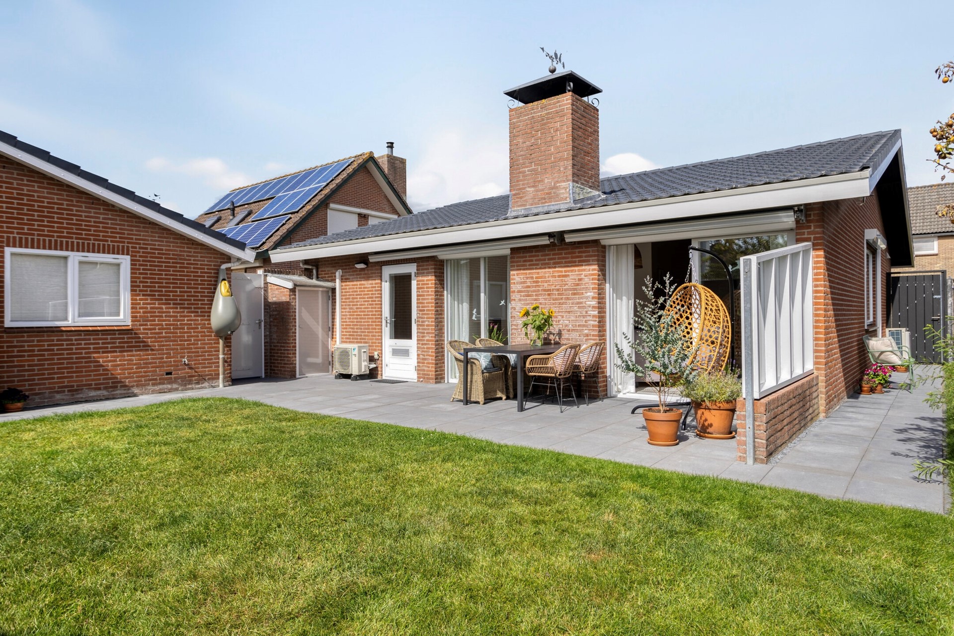 Buiten is het minstens zo aantrekkelijk: een recent vernieuwde omheining zorgt voor privacy, terwijl rolluiken rondom, buitenverlichting en een beveiligingssysteem bijdragen aan een veilig gevoel. De forse garage (24m²) met zadeldak is voorzien van zes zonnepanelen, een sectionaaldeur en aansluitingen voor wasmachine en droger. De verharde oprit biedt ruimte voor meerdere auto’s. De tuin is onderhoudsvriendelijk aangelegd en dankzij de ligging op het zuiden pak je hier al snel de eerste zonnestralen mee.